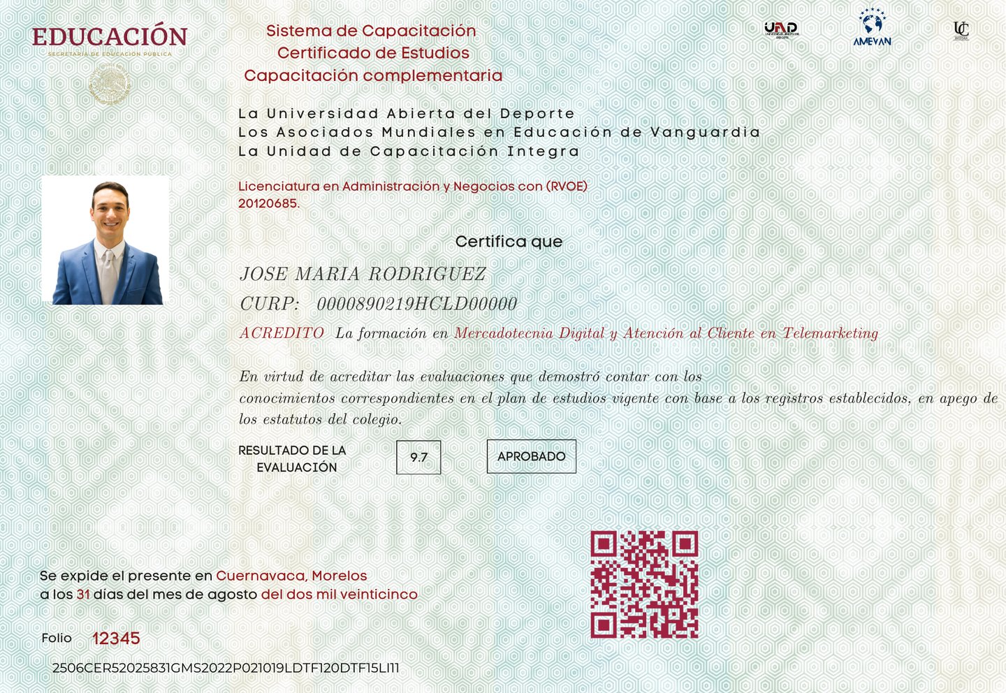 CERTIFICADO DE REGISTRO Y VALIDEZ OFICIAL